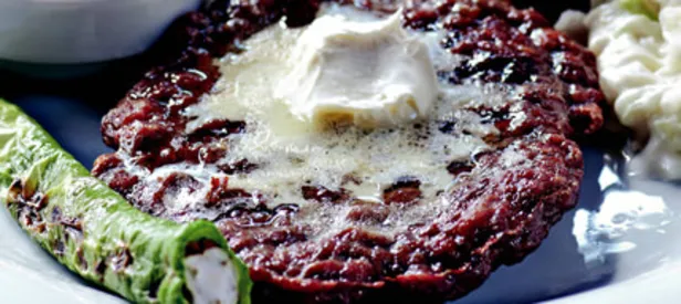 Kıymayı yoğurma kabına alın ve tuz ile birlikte 15 dakika yoğurun. Yarım saat dinlendirdikten sonra rendelenmiş soğan, karabiber ve pulbiber ilave edip, 15 dakika daha yoğurun. Hazırladığınız kıymayı 1 saat dinlendirin. Kıymadan mandalina büyüklüğünde parçalar koparın ve her bir parçayı tekrar ikiye ayırın. İkiye ayırdığınız parçanın birine elinizle bastırıp, hamburger köftesi şekli verin. Üzerine 1 çay kaşığı rendelenmiş kaşar peyniri ve 1 çay kaşığı doğranmış kuru et koyup, diğer parçayı üzerine kapatarak, bastırın. Diğer köfte parçalarını da aynı şekilde hazırlayın. Kızdırılmış sıvıyağda önlü arkalıkızartın ve üzerine 1 çay kaşığı kaymak koyup, sıcak olarak servis yapın..